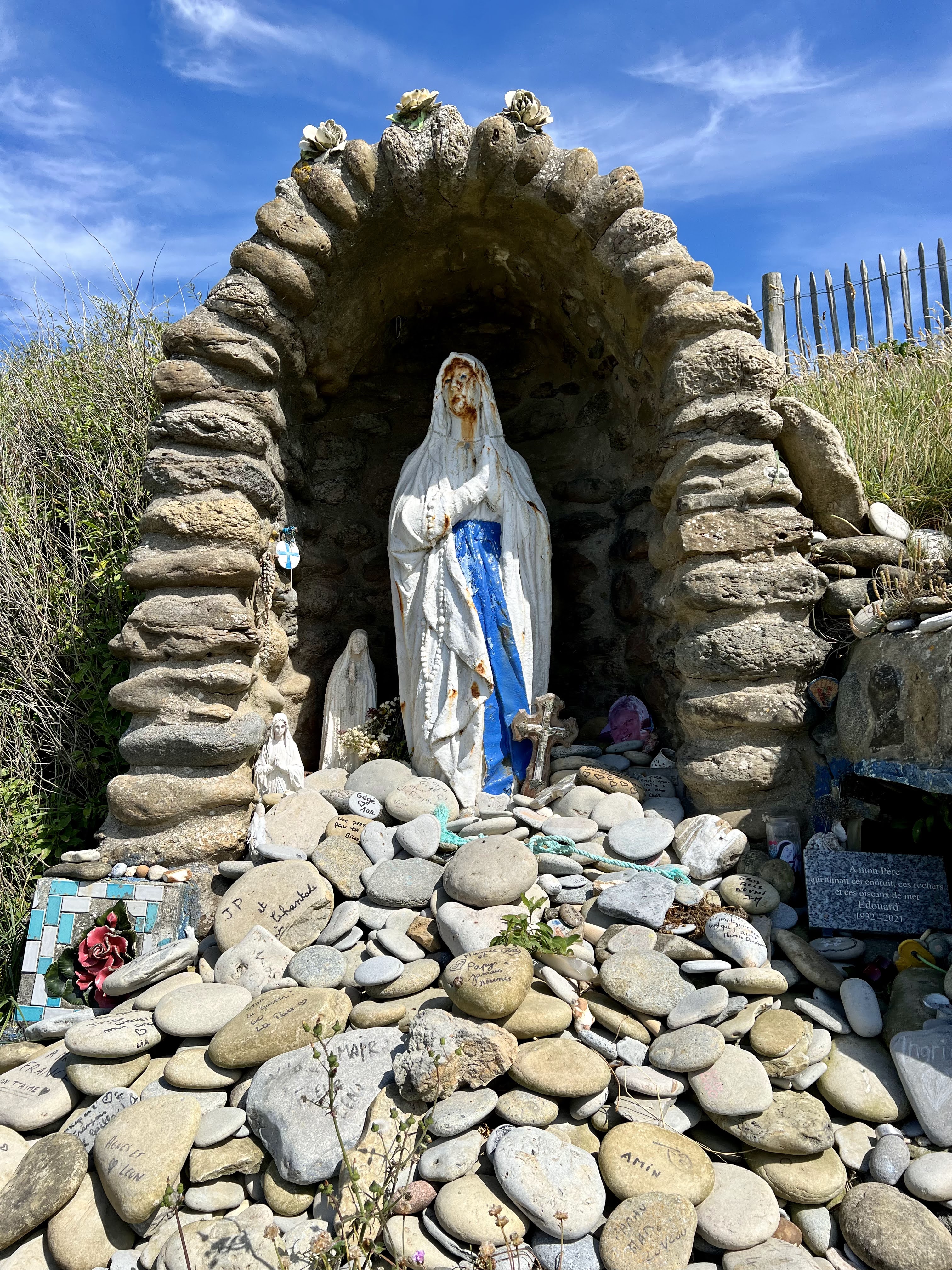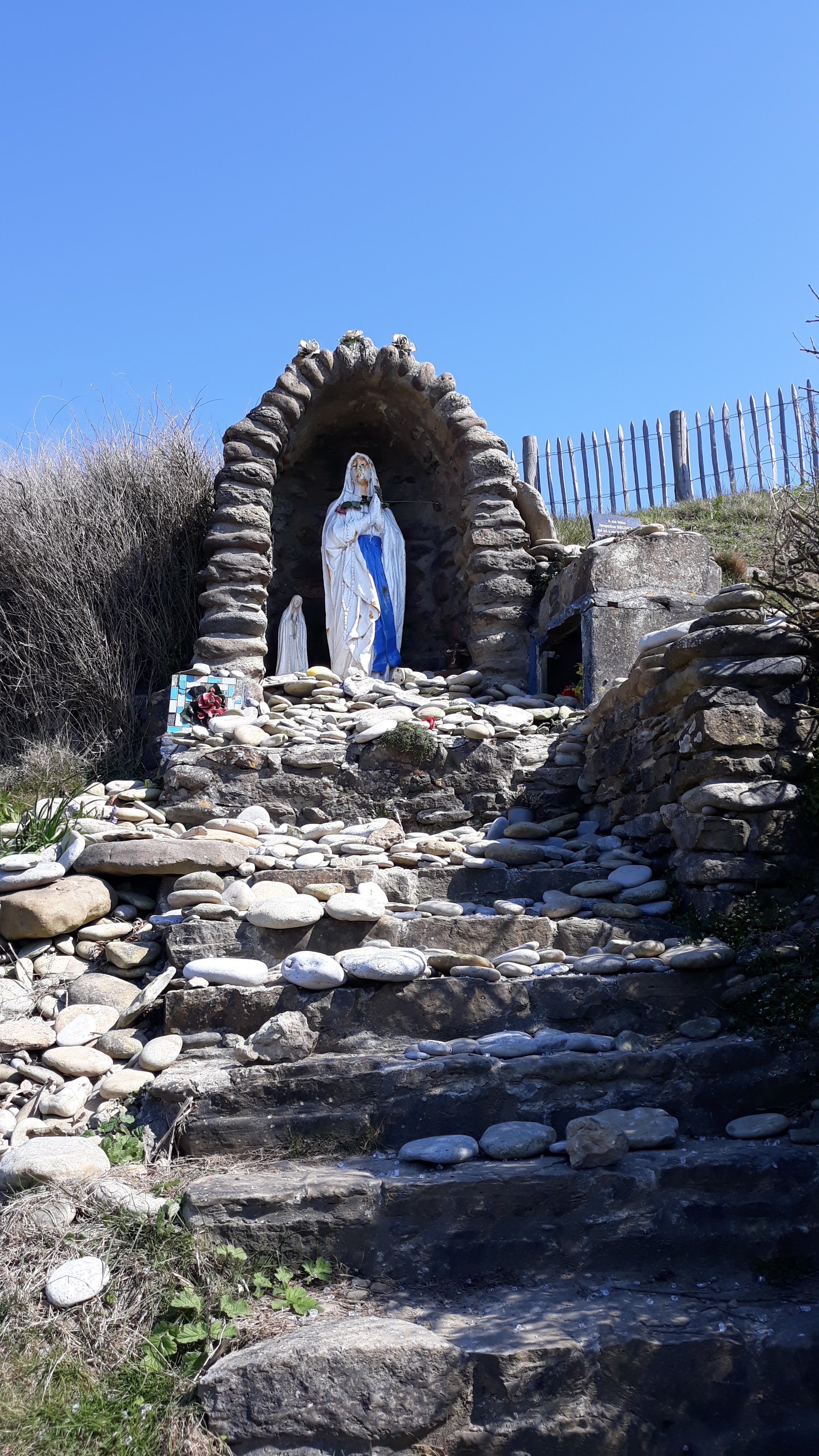 La vierge ressemble à celle de la grotte de Lourdes avec une inscription écrite sur le sol avec des cailloux blancs : « Notre-Dame de la Mer ». Une source ou plus exactement des infiltrations, s'écoule en ce point de la falaise. Les gens de la côte de Wissant au Portel, y viennent prier. Les chalutiers de Boulogne, quand ils passent devant la statue la saluent de trois coup de sirène